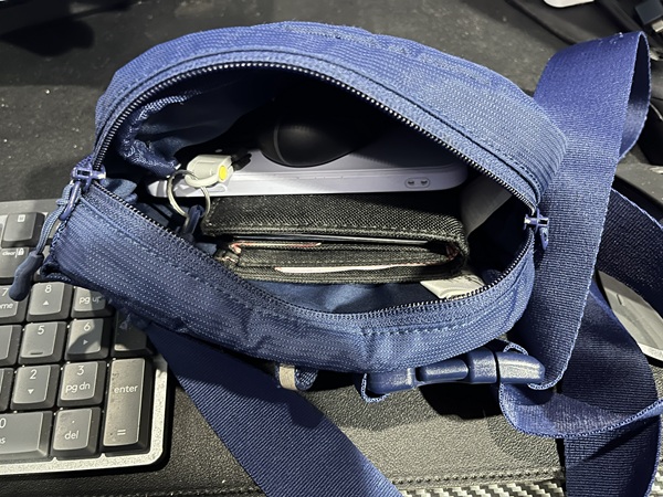 Why it’s good: Slightly larger and more functional than basic crossbodies, with enough room for essentials + small tech.